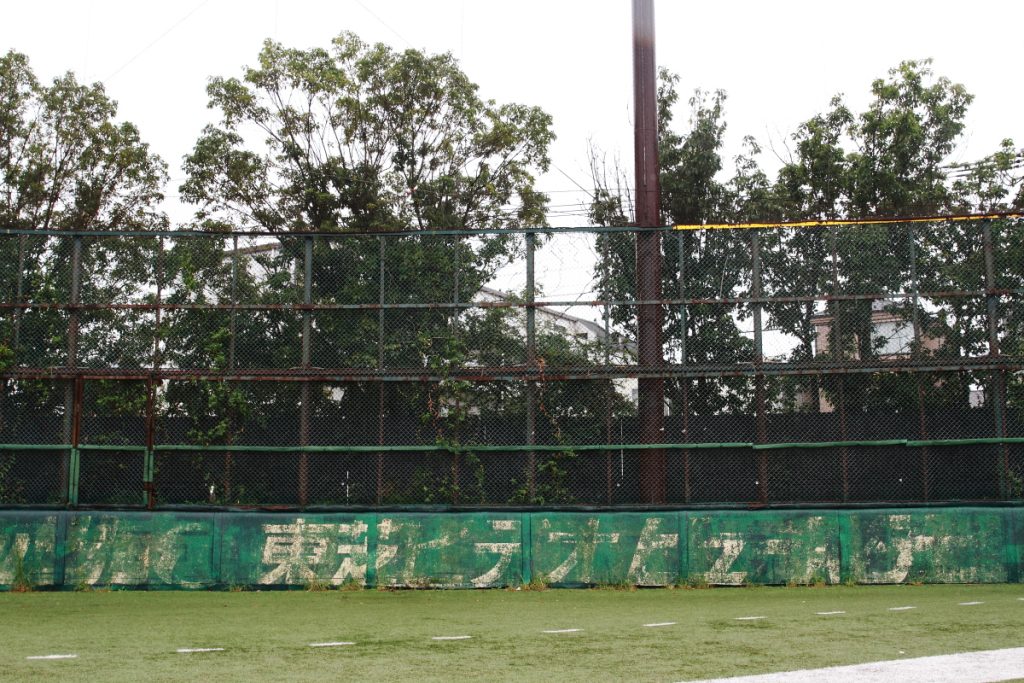 球場広告の“痕跡”とともに現存する外野フェンス。77年4月29日の大洋vs.阪神戦では、阪神・佐野仙好選手がここに激突して、頭蓋骨を陥没骨折。それが、いまや主流のラバーフェンスが普及するきっかけともなりました。