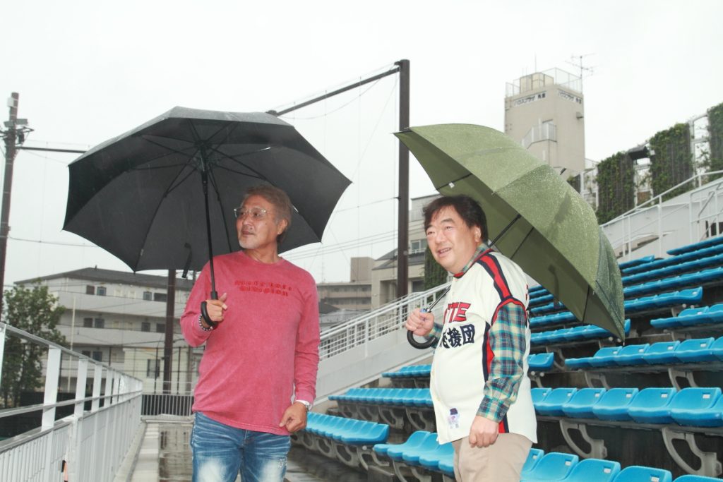 久々の来訪だという愛甲さん(写真右)は、見違えるように整備された現在のスタジアムに感嘆の声。一方の横山さん(同左)は、同地で節目ごとに開催されてきた“10・19”関連のイベントでも「語り部」として活躍中。