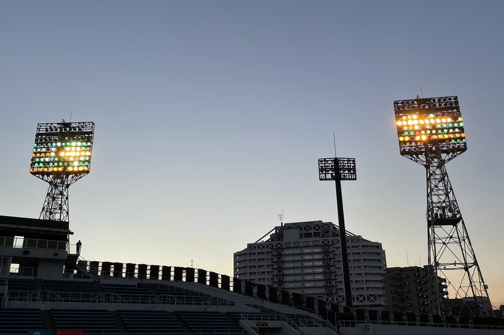最後まで残っていた照明塔の撤去に合わせて開催された23年1月7日の「村田兆治さんの思い出を胸に去り行く照明塔を見送る会」で、“カクテル光線”も見納めに。
