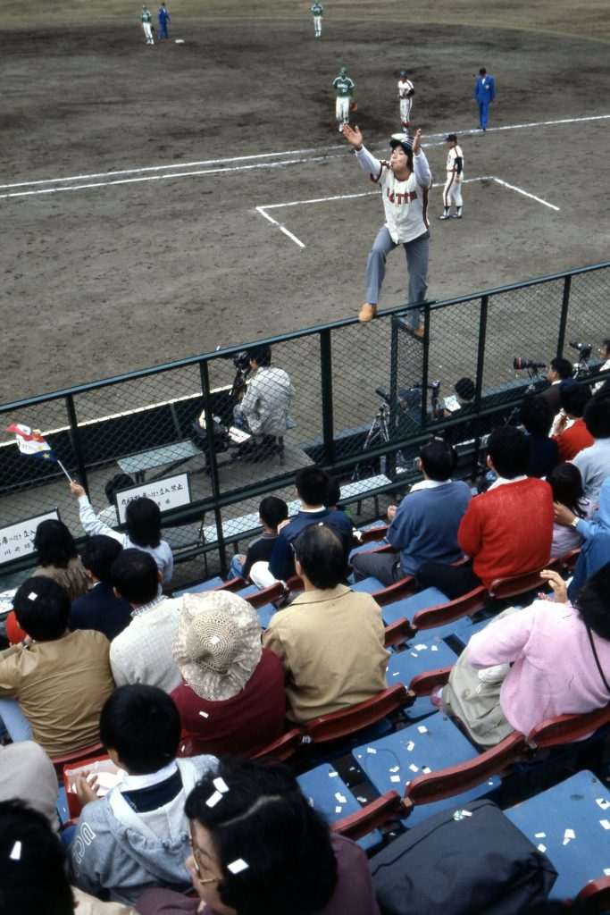 ホイッスルをくわえて音頭をとる若かりし頃の横山さん。いまでは考えられないけれど、当時のプロ野球は内野のベンチ上こそが応援団の“本流”でした。